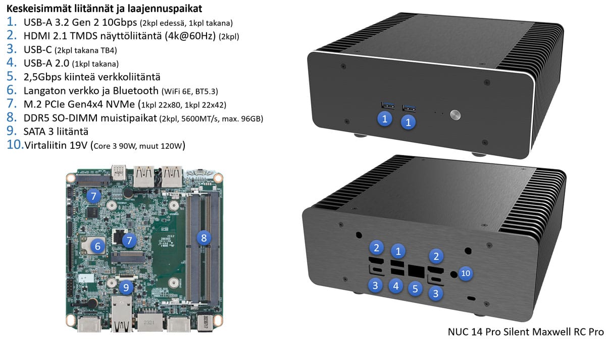 | Kotelo | TDP | 2.5" SSD | Suoritin | USB-C (etu) | USB-A (etu) |