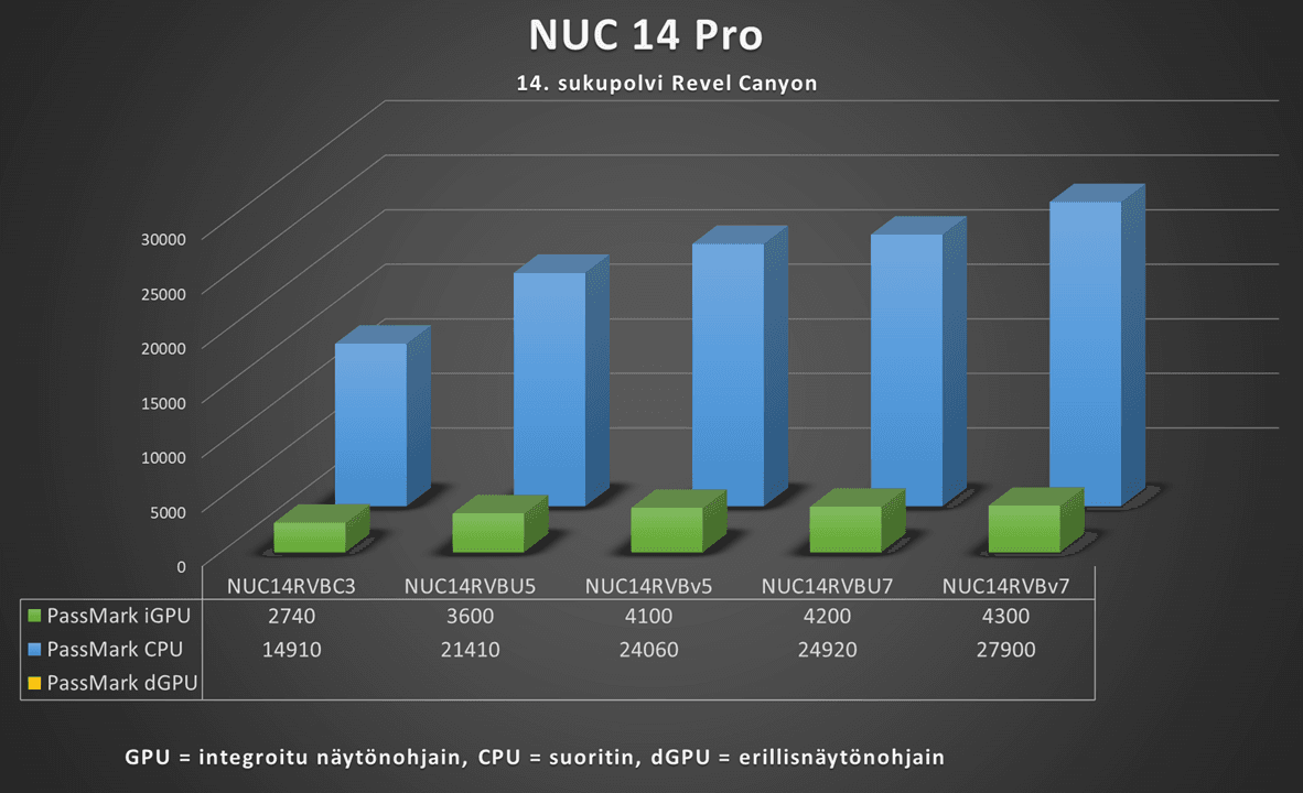 Suorituskykyvertailussa käytämme PassMark testituloksia, jotka antavat varsin hyvän kuvan eri suorittimien ja näytönohjaimien keskinäisestä suorituskyvystä peruskäytössä. PassMark ei kerro ihan koko totuutta, se mittaa suorituskykyä erityisesti jatkuvassa tasaisessa kuormassa, hetkellisissa kuormituspiikeissä Ultra 5 ja Ultra 7 suorittimien korkeammasta TurboBoost-taajuudesta on selkeää hyötyä. Lähes kaikille myynnissä oleville suorittimille ja näytönohjaimille löytyy PassMark testitulokset, joten pystyt vertaamaan NUC mallien suorituskykyä esim. nykyiseen tietokoneeseesi tai toiseen harkisemaasi malliin. Testitulokset löytyvät näiltä sivustoilta: www.cpubenchmark.net, www.videocardbenchmark.net.